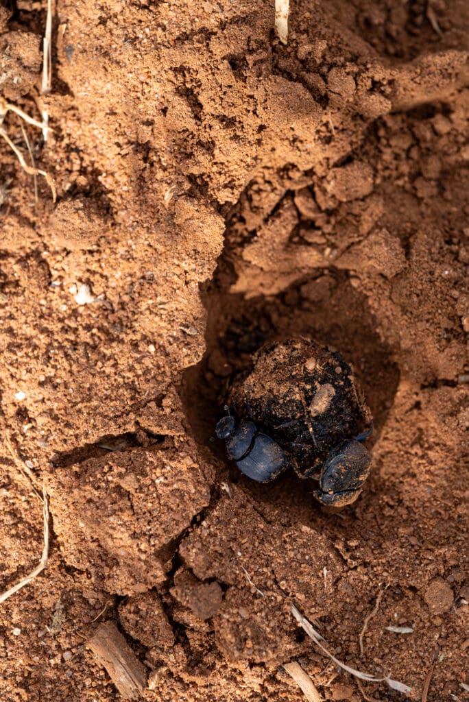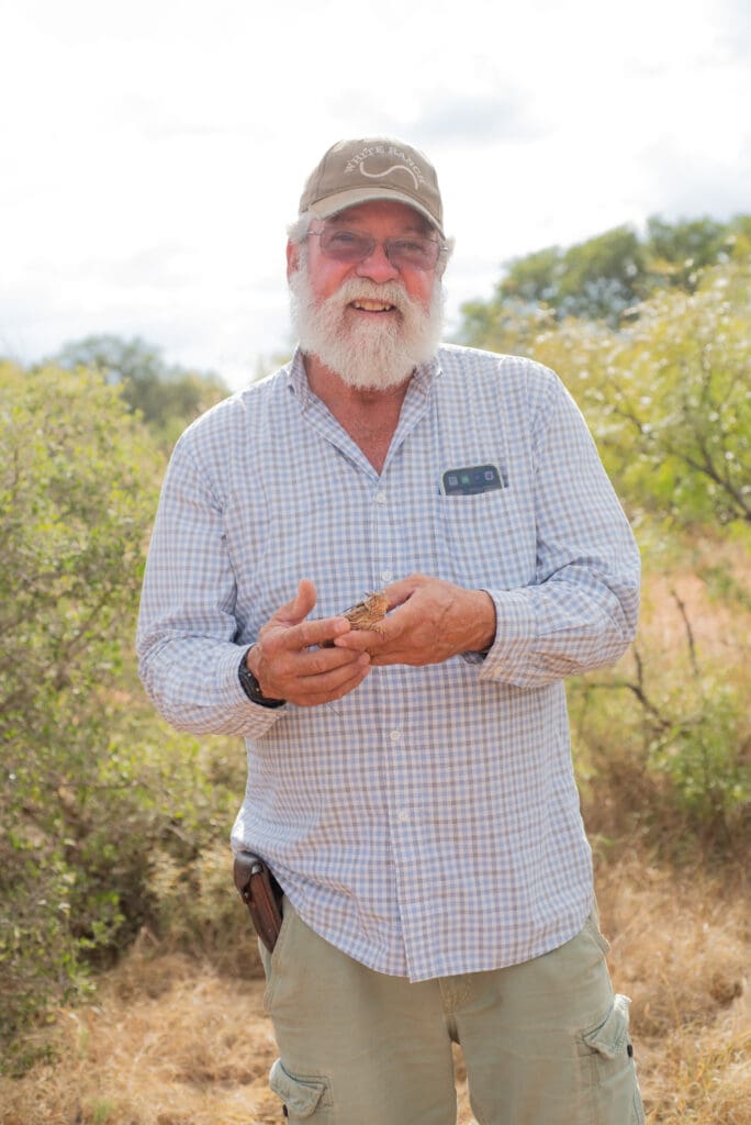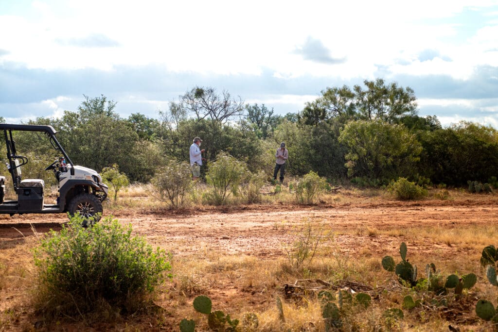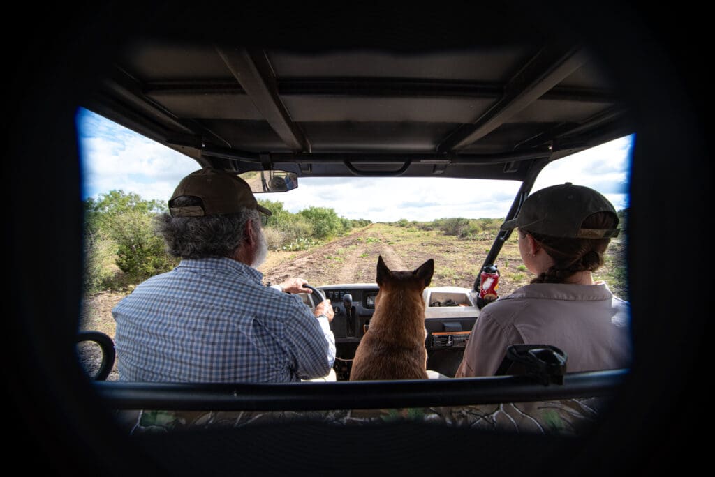My husband, Warren, and I drove onto the ranch. As we approached the house where ranch manager, Brian Wright, lives with his wife and of course their many animals, we saw Brian along with two donkeys, two horses, three dogs and a cat all in the yard starting their day. Pretty cool! Kira, Brian, Warren, our tour guide Gabi and I set out on Brian’s Kawasaki Mule for our journey to find the great Texas Horned Lizard! On this ranch over 100 Horned Lizards reside!