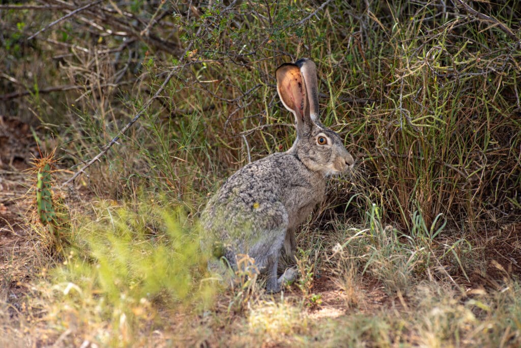 As we were driving on through the ranch Kira spotted a Texas Horned Lizard sunning in an opening next to the road. We stopped there and while we were admiring the Horned Lizard a Jack Rabbit came by to say “Hi”.